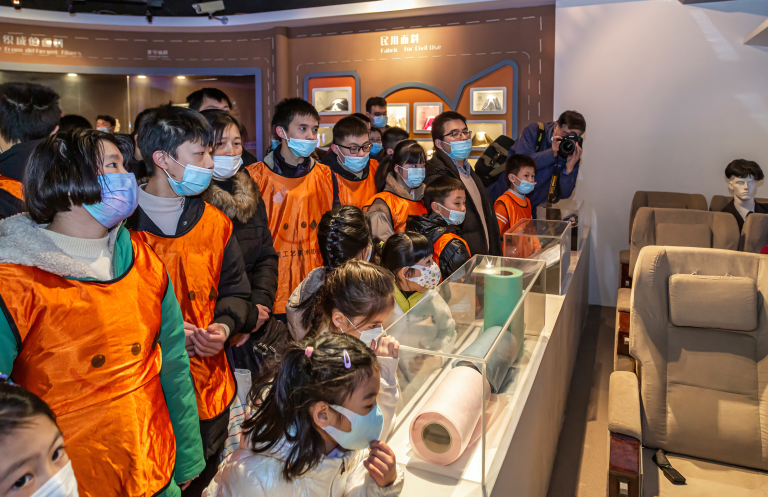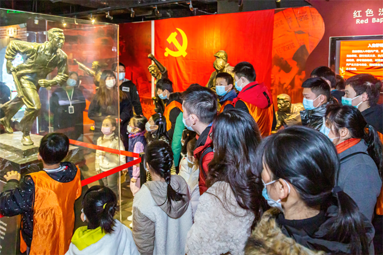 随后,学员们随着上海博物馆讲解耿老师,通过实物、资料、场景、图文、模型、多媒体等方式全方面了解了上海地区纺织业发展的历史,特殊孩子们在小小志愿者的带领下,个个听得非常认真,平日注意力聚集有困难的小朋友,竟然在耿老师通俗易懂的口语化讲解中能聚精会神一步步从头认真听到尾,连老师们都称赞这个参观+动手创作的训练营活动是激发孩子们对艺术热情很好的方式。建党百年的时刻,在展馆听到顾正红为代表的上海纺织的工人阶级在中国共产党领导下,积极参与反帝、反封建、反压迫斗争悲壮历史的故事,孩子们深受鼓舞,纷纷站在党旗和雕塑下合影留念。