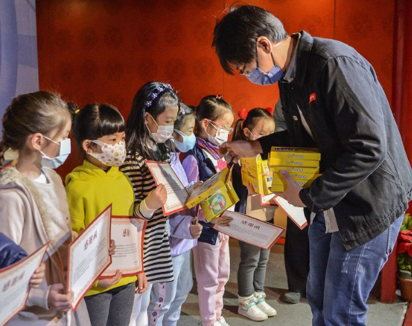 训练营活动尾声,史进老师代表晨光科力普和中国移动采购共享服务中心采购三部党支部向孩子们发放了图书及晨光文具盲盒奖品。与会领导和嘉宾共同还为项目优秀学员颁发了相关证书及晨光文具奖品。