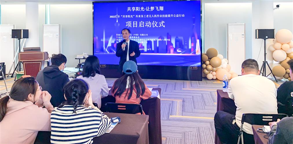 4月16日,2022汇丰“共享阳光”外来务工者无人机作业技能提升公益行动项目正式启动。上海市慈善教育培训中心郑楚荣副主任,上海奥根航空乘务专修学院谢潮龙院长、上海玄风航空科技有限公司黄蓉副总经理等出席了启动仪式,松江地区参加培训的近50余位进城务工者学员参加了启动仪式,启动仪式由郑楚荣副主任主持。