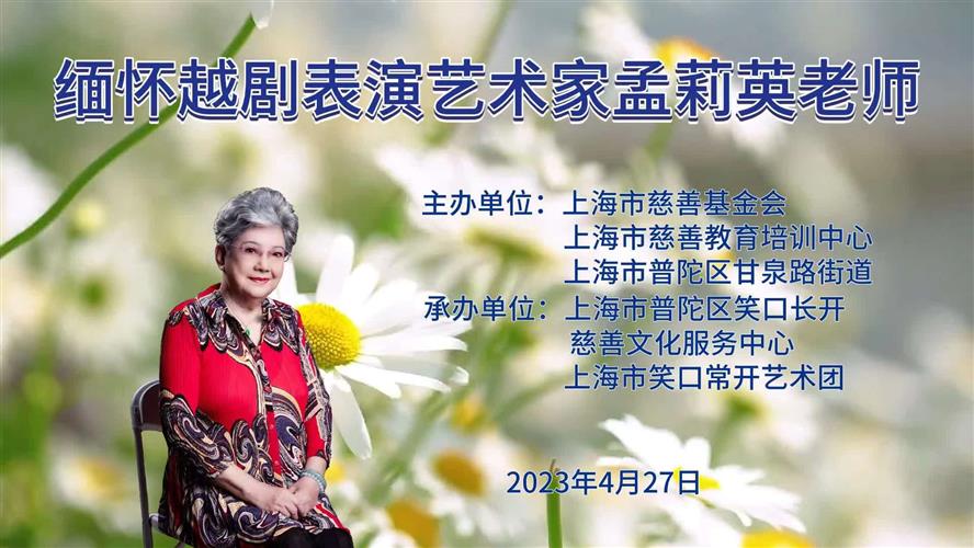 2023年4月3日,越剧表演艺术家孟莉英老师因病去世,享年89岁。4月27日,在上海市普陀区甘泉社区文化中心,上海市慈善基金会、上海市慈善教育培训中心、上海市普陀区甘泉路街道,上海市笑口常开艺术团共同举办了越剧表演艺术家、慈善之星孟莉英老师的追思会。