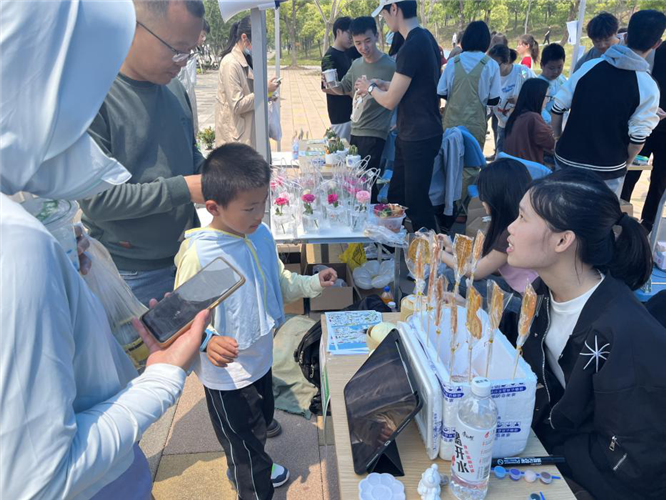 13日上午10点销售实践正式开始。活动现场,学员们分工明确、每个人都有角色扮演,有的负责现场布置、有的负责揽客…,为了引流,他们各出奇招,30多度的高温也阻挡不住他们的热情,大喇叭、小蜜蜂、玩偶服齐上阵,吆喝声此起彼伏,更是设计了很多有趣的小游戏吸引了众多顾客前来围观。