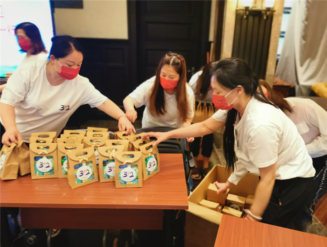 肖战粉丝小飞侠们整理从各地寄来的捐赠物资,并将105份日用品分别装入礼包。