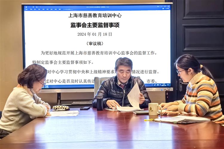 1月18日,上海市慈善教育培训中心在陕西北路会议室召开了第四届监事会第三次会议,审议了上海市慈善教育培训中心第四届理事会第三次会议议程和主要内容,审议通过了监事会的主要监督事项,讨论了从2024年起在中心每年初理事会上报告监事会工作的主要内容,通过了监事会决议。