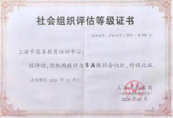 1月29日,在静安区社会组织规范化建设评估等级颁证授牌仪式上,上海市慈善教育培训中心接受了静安区民政局所颁发的5A级社会组织铜牌。这又是中心第三次获得5A级社会组织称号。