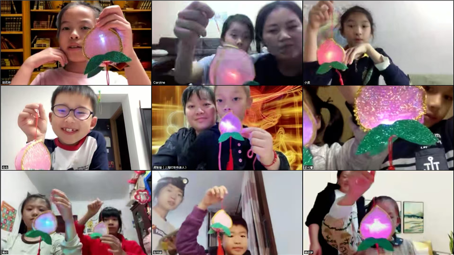 龚老师从灯彩的制骨、裱糊、滚边、贴叶等步骤逐一讲起,边讲边教,在制作和授课形式上,保留上海灯彩的制作步骤,简化工艺流程,让每一位体验者在动手学习制作灯彩的过程中感受非遗文化的魅力和匠心精神,同时也能培养耐心和自信心。直播课堂上,大家互动积极,小学员们动起手来也毫不含糊,最终做成一个个寿桃送给长辈。