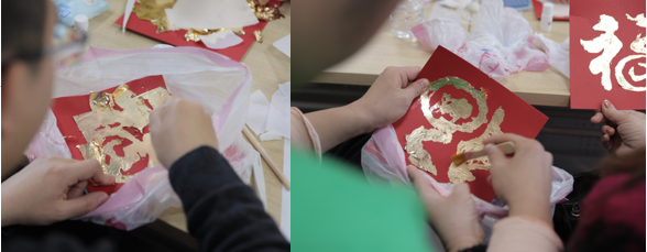 在体验传统工艺之美的非遗金箔年画手作活动中,非遗传承人、上海金山图案与产品设计师、上海大学PACC非遗手工艺导师程绮老师首先为学员普及了中国传统文化艺术中的珍贵遗产——金箔年画,并为大家介绍了可以追溯到唐代的相关创作工序及其背后的技术实现历程、相关年画的审美视角等内容,随后在老师和助教的指导下,每位学员都做出了一幅闪闪发光、形色迥异的“年画福”。在创作的过程中,每一道工序都需要极大的耐心,老师根据现场学员情况,建议大家将工具包带回家,可以根据不同的年画主题和风格,创作不同视觉效果的年画。