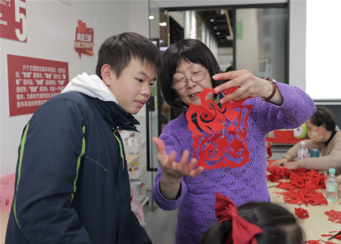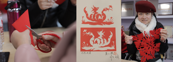 在体验传统工艺之美的非遗剪纸年画手作活动中,上海市高级工艺美术师、国家级非遗上海剪纸代表性传承人、上海市工艺美术大师奚小琴,从非遗年画剪纸的历史说起,为大家普及了非遗剪纸年画的分类、民俗应用、视觉形象、造型格式等蕴涵的丰富的文化历史信息,表达了广大民众的社会认知、道德观念、实践经验、生活理想和审美情趣,具有认知、教化、表意、抒情、娱乐、交往等的多重社会价值。随后指导大家挥起剪刀,根据课堂所学自行创作自己心仪的年画作品,大家剪得不亦乐乎,直到课程结束还不肯放下剪刀,彻底沉浸式体验了一把非遗剪纸年画的魅力。
