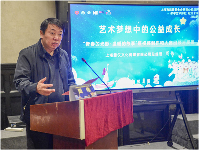 研讨会上,上海霏仪文化传媒有限公司总经理周伟作了《艺术梦想中的公益成长“青春的光影·温暖的故事”短视频制作和大赛回顾与展望》的分享,该子项目创建于2019年,由上海市慈善教育培训中心与上海胜熙文化传媒有限公司等单位合作开展。目的是通过青少年创作的短视频,传播慈善文化和人间温暖的故事,弘扬慈善公益精神。项目通过让大学生、特殊青少年师生及其家长,寻找身边感人的温暖故事,拍摄、剪辑、制作短视频,组织“青春的光影·温暖的故事”短片评比和公益观影,展现人间大爱,引导人们走进慈善、践行慈善,为社会提供正能量。目前已创作作品564部,评选出优秀获奖作品50余部,并在社会上展播。通过创作与大赛,在平台上涌现了数百位有才华、有温度的青年创作者,作品累计展映观众超万余人。许多同学首次通过艺术参与公益,更加坚定了服务社会、关注弱势的初心,也为自己找到人生新的方向。