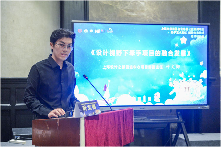 上海设计之都促进中心项目部副主任叶文卿以《设计视野下牵手项目的融合发展》作了介绍,他说,这些年来,上海设计之都促进中心通过一系列精彩的展示活动,让特殊青少年的创意艺术作品,让项目成果走进米兰国际手工展、走进米兰双城设计教育论坛和比利时首都布鲁塞尔举办的“上海国潮新品展”,从商场展厅到地铁屏幕,走进城市的流动驿站,在国际国内的舞台上大放异彩。当特殊青少年的创意被看见、被尊重、被转化为价值,改变就已发生,他们收获的不仅是掌声,更是融入社会的自信。我们收获的不仅是成果,更是“设计向善”的力量。