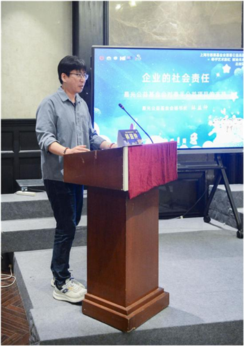 晨光公益基金会秘书长林益仲介绍了《企业的社会责任——晨光公益基金会对牵手公益项目的支持》,上海晨光文具股份有限公司作为全球文具行业的领军者之一,始终秉持 “引领行业向善” 的理念,积极践行社会责任。上海晨光公益基金会自成立以来,对“牵手艺术彩虹·献给未来地球” 慈善教育项目给与大力支持,先后一共为项目投入资金支持200余万元,捐赠价值数十万元的文具套装,包含彩笔、油画棒、素描纸等,充分利用晨光社会资源,对特殊孩子的结对开展培训、组织大赛展览,以及后续获奖作品产业化生产等公益活动的开展,助力特殊孩子的健康成长。