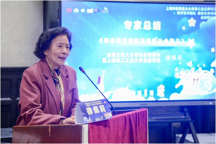 全国女性人才研究会理事长、上海第二工业大学原党委书记徐佩莉作了《牵手项目创新发展的社会意义》的发言。她说,一个公益项目为什么能持续发展12年,受到青少年的青睐,获得社会的高度赞誉,那是因为它具有新时代的鲜明特色、激情的生命力和暖心的感召力。项目的实施,呈现了鲜明的特点,一是具有时代特色。适应和助力创新国家和设计之都对创意设计人才高地建设,适应新时代青少年创新发展的需求;二是机制创新。搭建政府指导、产教商媒融合、校企合作培养、发掘创意设计人才的新模式;三是大爱奉献。推动创意艺术教育培训与公益慈善融合发展的新模式,提升了城市的暖度;四是立德树人。将慈善育人融入艺术教育,塑造青少年美好品格,为“三全育人”和“五育并举”的教育方针出力。