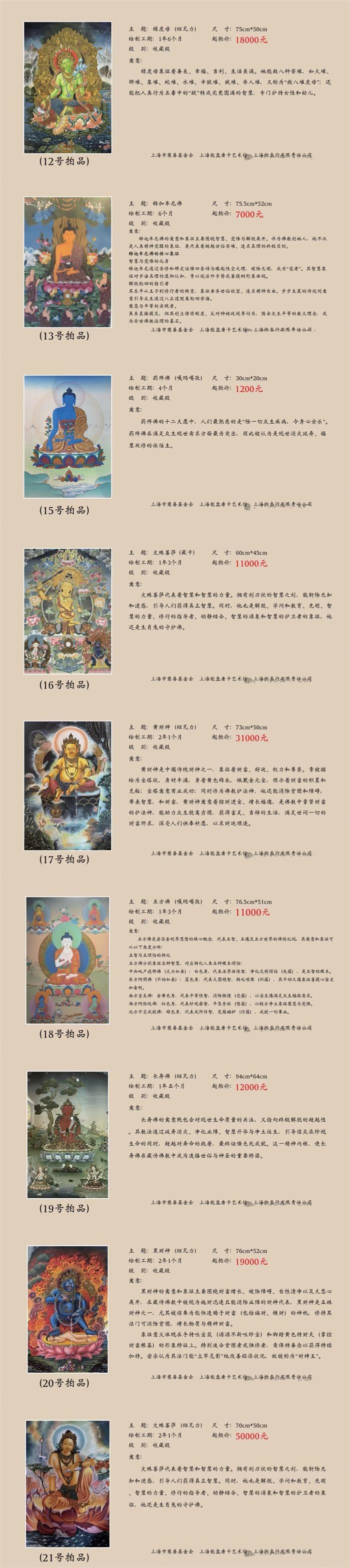 上海市慈善基金会与上海能盘唐卡艺术馆精心挑选了20幅唐卡,展现了文殊、药师、黄财神、绿度母等题材,寄托了美好的寓意,将艺术、藏传佛教及慈善元素融为一体,使画作不单单是一件物品,而是震撼人心的艺术品。