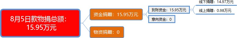 截止 8月 5日 15:00,当日收到或承诺捐赠金额为 15.95万元,其中入账的捐赠资金 15.95万元(线下捐赠 14.97万元,线上众筹 0.98 万元);无新增物资捐赠。
