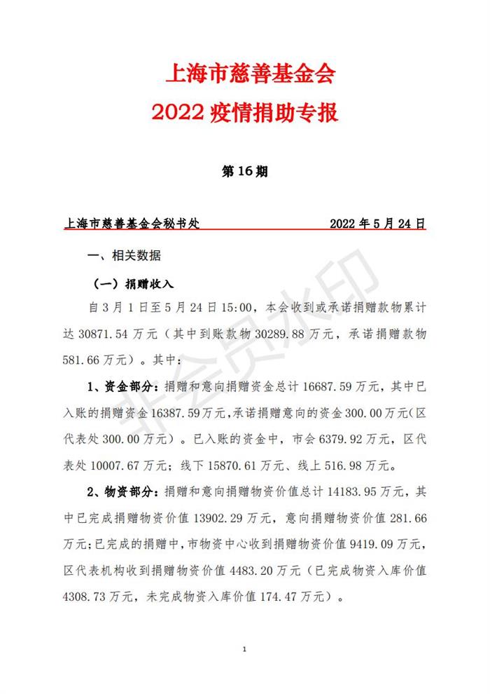 上海市慈善基金会2022疫情捐助专报(第十六期)