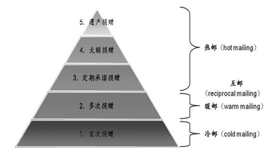 图-2中,金字塔右边对应的部分是数据库(直邮)筹款经历的基本阶段。“冷邮”阶段是依据尚未经过测试的“冷数据”发送的邮件;得到首次回复或捐赠后,成为“暖数据”;再根据“暖数据”发送邮件则进入“暖邮”阶段,可能会得到捐赠人再次或多次捐赠,从而成为“热数据”;继续通过“热数据”发送邮件就进入“热邮”阶段。这时,很可能争取到捐赠人的定期捐赠和大额捐赠,直至遗产捐赠。