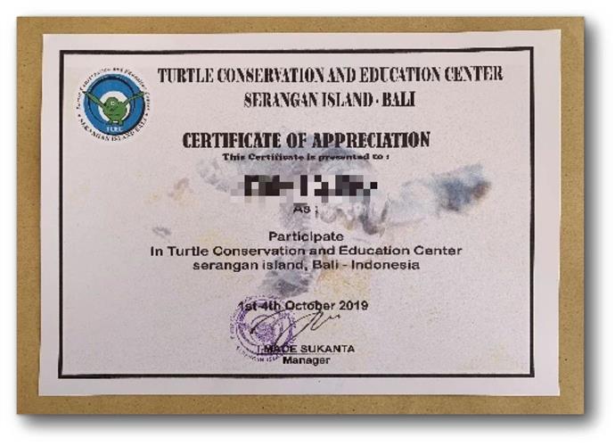 回到基地后的最后一个环节,是领两张所有“国际志愿者”都有的证书,一张是国内义工旅行公司A的、另一张是巴厘岛海龟保护基地的。这一期项目到此便结束了。