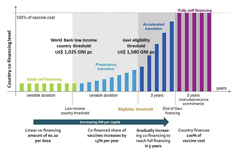 具体来说,Gavi将目标着眼于让所有极贫困国家的儿童可以接种到挽救生命疫苗,并设立“毕业”机制,提出当受助国连续三年超过世界银行低收入国家(2019年标准为人均国民总收入GNI低于1025美元)水平开始,Gavi会逐年减少对援助疫苗支付的百分比(约15%),直到这个国家从Gavi资助中“毕业”,转型成为能够完全自行支付疫苗的采购费用的国家。
