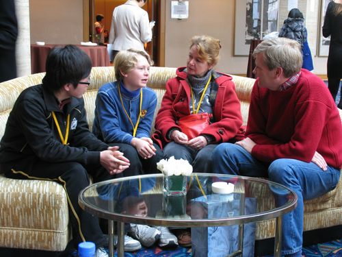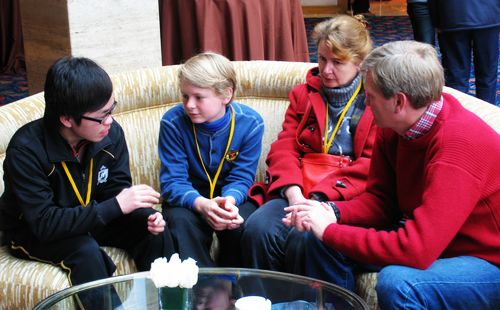 在今天的捐资助学见面活动的现场,有一位金发碧眼的孩子十分惹眼,他是国际友人Foyston家的孩子。Foyston一家来到上海已经有15年。在问及为何会想到把自己的孩子也带来时,Foyston夫妇表示,希望这样的结对助学不但可以帮助到需要帮助的受助学生,也让自己的孩子能够得到教育,在实践中感受到慈善理念的熏陶。小Foyston的中文名字叫小霍,在上海住了12年,已经可以熟练地运用英文与中文两种语言进行表达。在今天与他们家庭的结对受助学生张同学的见面中,Foyston夫妇有意让小霍在交谈中担当着翻译的角色。从开始的有些紧张,到适应后的沉着应对,小霍的认真使他最终很好地担当起了桥梁的作用,而他们交谈中时而传出的欢笑声也引得边上的结对友人纷纷侧目。