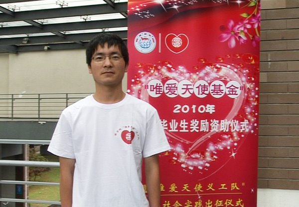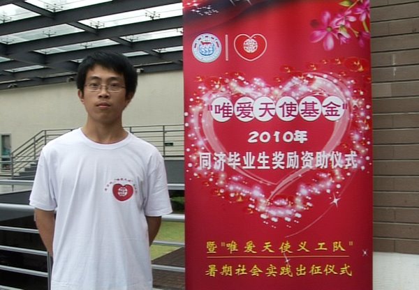 同济唯爱天使义工队队员:我叫周超辉,老家甘肃省陇南市,2008年考入同济大学。 美好的大学很令我向往,但大学那昂贵的学费和生活费却是让我和家人头疼。我和二哥都考上了大学,父亲前些年患了风湿病,父母的负担很重。来到大学后,学校给予我很多帮助,尤其是唯爱天使基金,给予了我巨大的帮助。刚入学后不久,我申请到了唯爱天使助学金,当时自己很高兴,生活费不用再愁了,父母的负担减轻了不少,自己可以安心的学习了。 2009年,我加入了唯爱天使义工队,光荣的成为一名义工队队员。我们义工队两周有一次活动。我们到宝山区的金色晚年敬老院,在那里我们和老人们一起聊天,一起散步,一起包饺子,觉得特别的高兴,特别开心。在奉献社会时所得到的那份幸福让我难以忘怀。