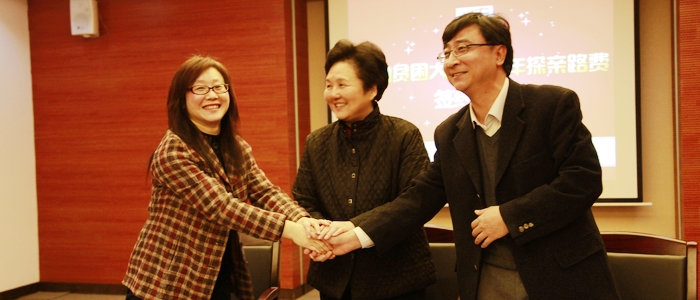 金闽珠(中)与东方CJ公司总经理(右)及受助高校老师代表(左)成功签约