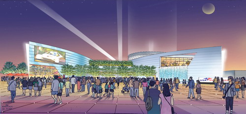这里每晚都有大型演出。周一至周五每天两场驻场演出,将由中国东方歌舞团承担。周末出场的是世界巨星演唱会等“重量级”节目。有别于一轴四馆中其他场馆的方方正正,世博文化中心外形是碟形的,夜晚的灯光设计,突出了这一建筑的特点,让它更加灵动轻逸,晶莹通透。
