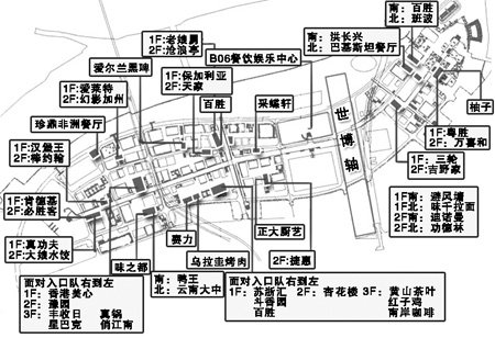 据悉,主办方在园区公共区域共规划了85000平方米的餐饮服务设施。园区内的主要餐饮点将提供来自中国各地和世界五大洲的美味佳肴,其中A片区13家,B片区25家,C片区32家,D片区23家,E片区9家,世博轴内23家。此外,园区内还有70个可口可乐零售店、45个伊利冷饮店、3个克里斯汀饼屋、3个元祖糕点店和9个便利店。